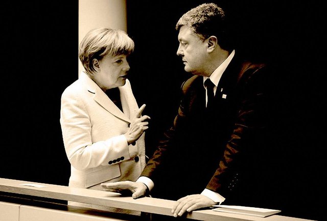 Блокування Німеччиною плану дій щодо членства України в НАТО у Бухаресті, зволікання з підписанням угоди про асоціацію (УА), намагання схилити опозицію до збереження Януковича на посту президента під час кризи кінця 2013 р., підтримка кандидатури Віктора Медведчука на переговорах з представниками України, врешті наполегливе вмовляння Порошенка діяти стримано і в Криму, і на Донбасі дали підстави окремим коментаторам в Україні та на Заході заявити про «змову» Путіна і Меркель проти України. Суть змови у їхньому розумінні полягає у змушуванні Порошенка погодитись на особливий статус Донецької та Луганської областей у складі України.
