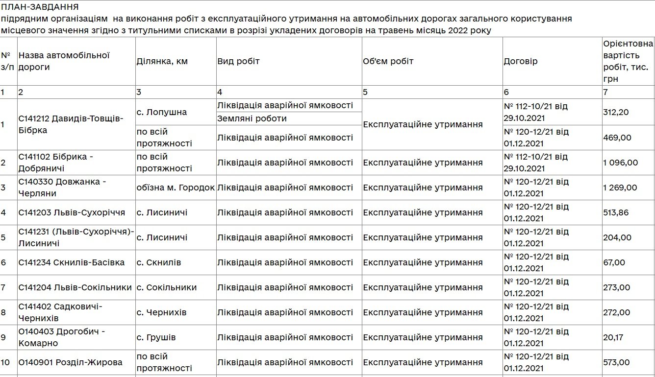 Розпорядженням голови ЛОВА від 20 травня, затверджено переліки доріг загального користування місцевого значення та вулиць і доріг комунальної власності, які ремонтуватимуть у 2022 році на період дії воєнного стану.