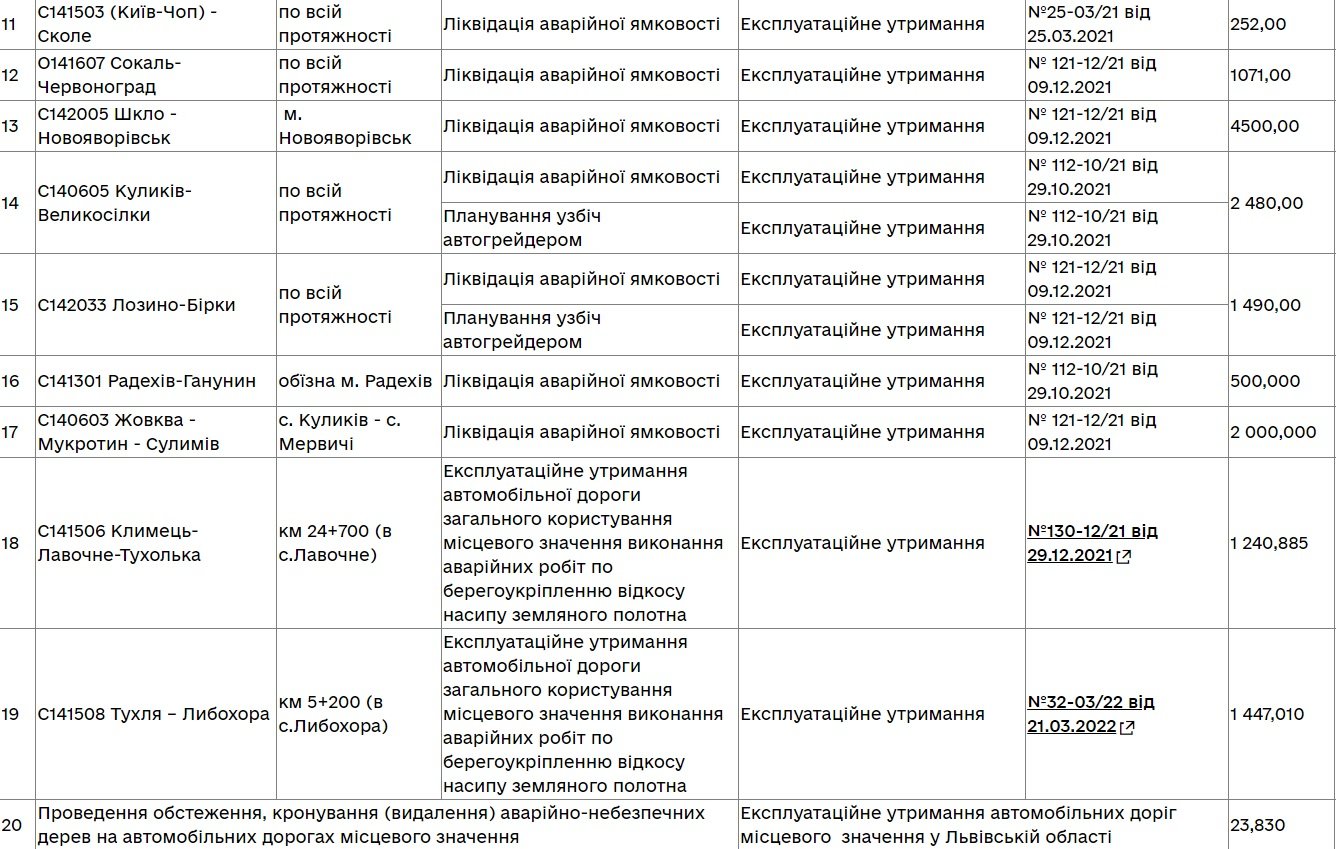 20 млн грн розподілено на експлуатаційне утримання 19 доріг, ще 3,5 млн грн передбачено на ремонт та утримання доріг Самбірської міської громади. За ці гроші на дорогах планують ліквідувати аварійну ямковість, а в Самбірській громаді – провести поточний ремонт доріг пневмоструменевим методом.
