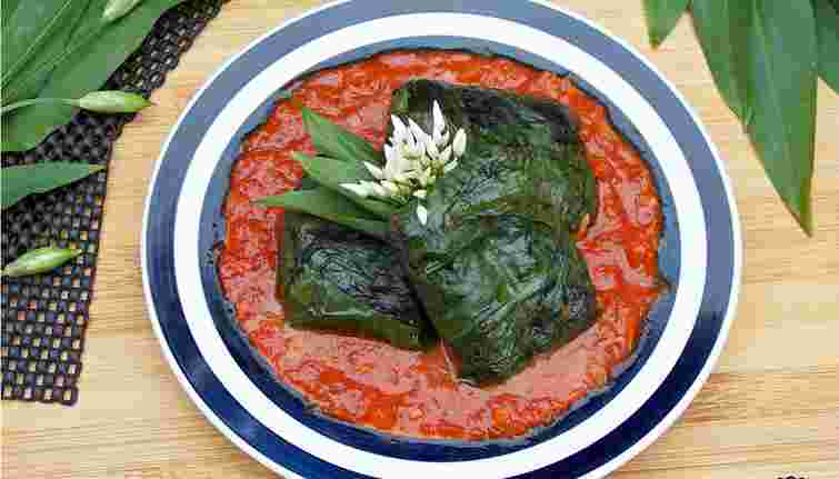 Можна зробити так: листочки черемші навхрест покласти глянсовою стороною на стіл. У серединку хрестика покаласти чайну ложку начинки. Кінцями одного листочка обернути начинку з боків і конструкцію, що вийшла, загорнути в другий листок.