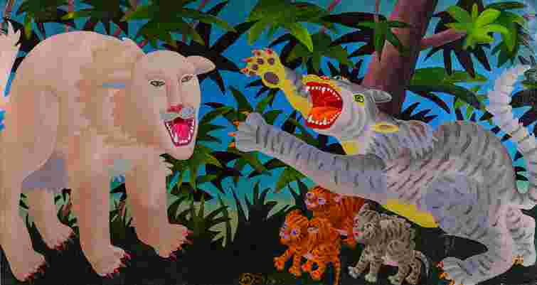 Образи ніяк не змінились, в мене власна мова зображення. Тигр є символом агресії, чорний лев символізує сили зла, світлий лев – силу та шляхетність. Ведмідь – це щось таке зле, з півночі. В мене всі персонажі мною вигадані. Мені зовсім не потрібно малювати танк таким, як він є, змальовувати з фотографії. Якщо я зроблю якесь чудовисько з носом, то ось вам буде і танк.