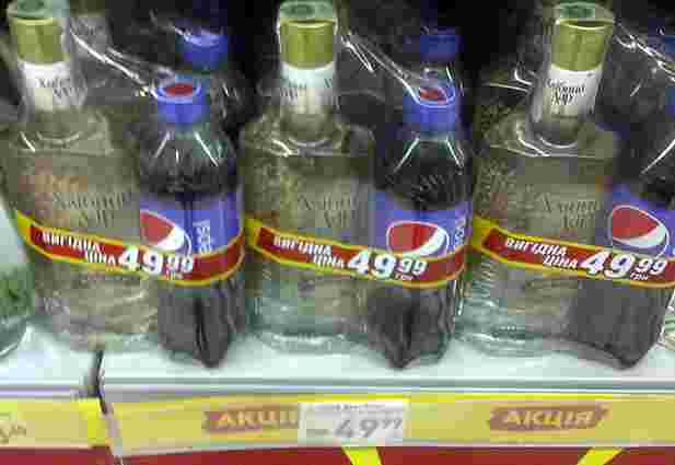 Як продати горілку дешевше за мінімальну ціну 49,90 грн, встановлену державою, а отже – отримати конкурентну перевагу на ринку фактично незаконним шляхом? Дуже просто – потрібно до пляшки горілки додати якийсь бонус, що буде безвідмовно діяти на споживача. Саме такий підхід до бізнесу яскраво демонструє набір «горілка Хлібний Дар + пепсі-кола», що нині прямо з магазинних полиць радує очі охочих до дешевої випивки.