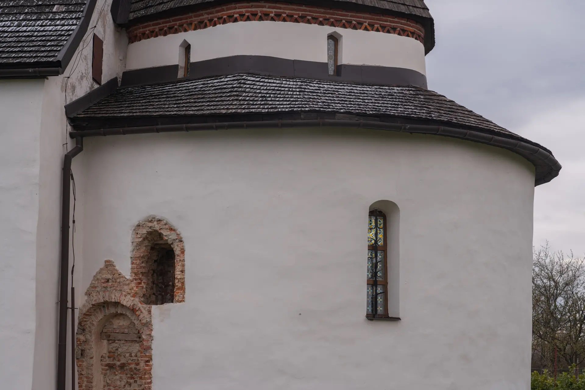 Будівля церкви складається з двох різних частин. Цегляна ротонда ХІІІ ст. була родинною каплицею магната Амадея Аба. Зверху її купол схожий на шестипелюсткову квітку. У південно-західній частині святилища є замурований півциркульний портал із невеликим трикутним фронтом над ним, що має ознаки романського будівництва. Цій архітектурі притаманні товсті оборонні стіни, вузькі прорізи вікон. У небезпечні часи кожен храм був фортецею.