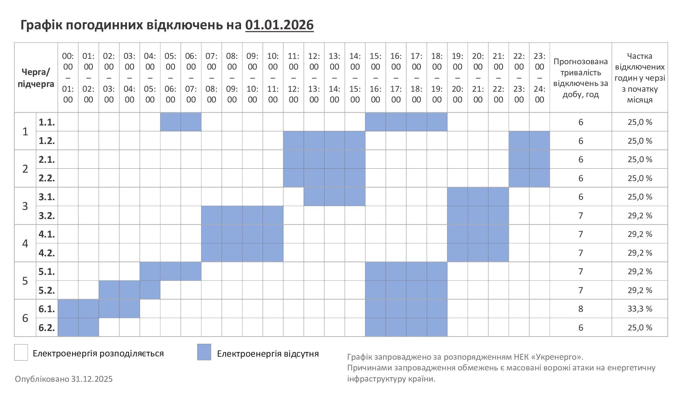 Актуальний графік відключень електроенергії на 31 грудня та 1 січня