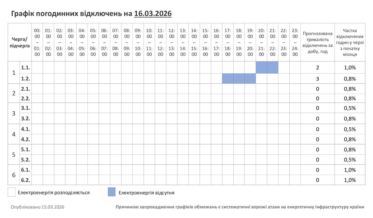 Актуальний графік знеструмлень на 16 березня
