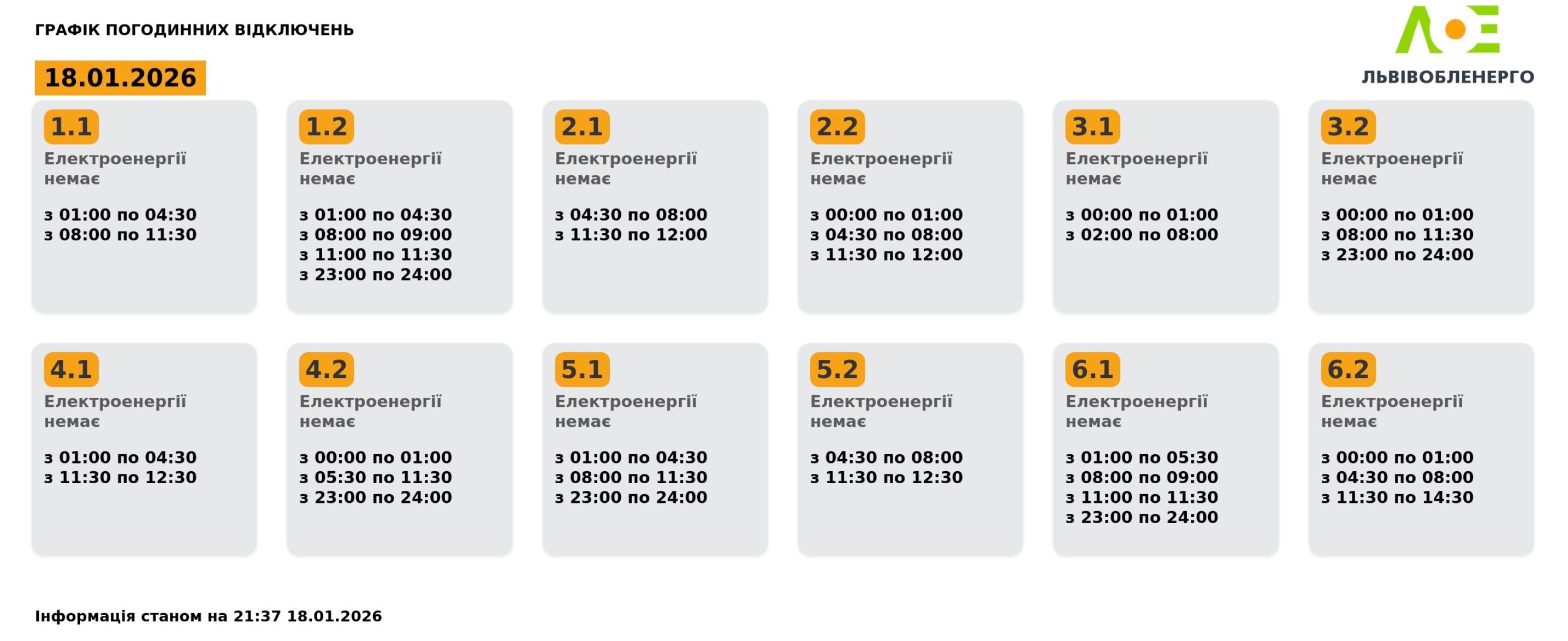 У неділю 18 січня, на Львівщині будуть застосовувати графіки погодинного відключення електроенергії. Споживачів просять економно використовувати електроенергію.