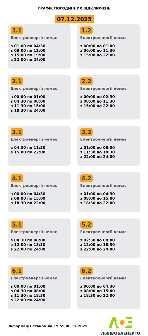 У суботу, 6 грудня, та у неділю, 7 грудня, за розпорядженням «Укренерго», на Львівщині застосовуватимуть графіки погодинного відключення електроенергії. Споживачів просять економно використовувати електроенергію.