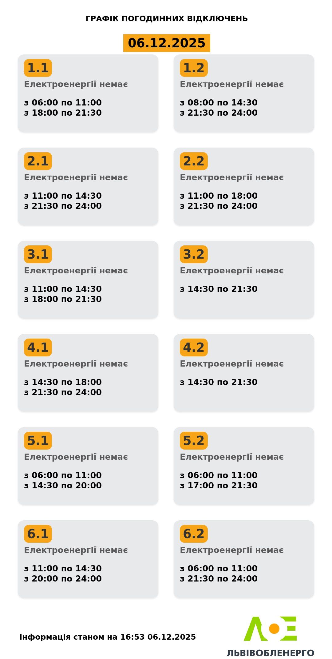 Дізнатися свою чергу відключень можна, скориставшись чат-ботами у вайбері, телеграмі, мобільному застосунку «КомКом» та на сайті «Львівобленерго» у розділі «Чому немає світла».