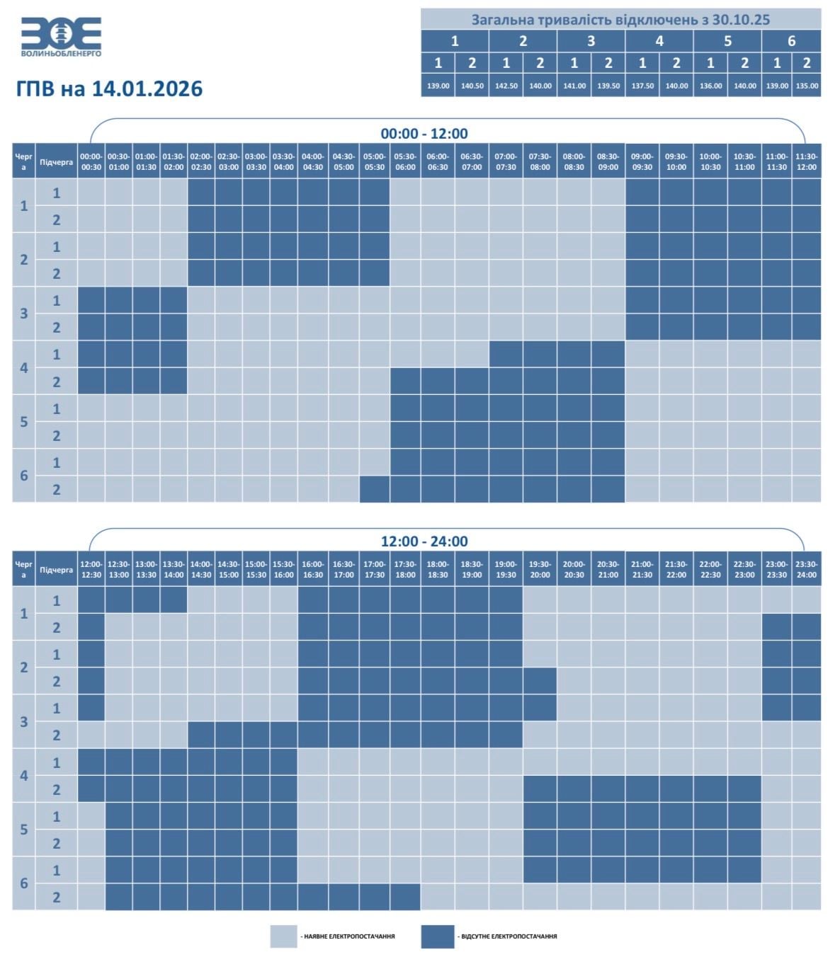 У середу, 14 січня, на території Волинської області запровадили графік погодинних відключень світла. Про це повідомляє ПрАТ «Волиньобленерго».