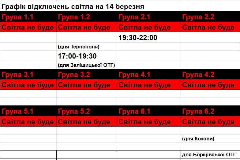 В НЕК «Укренерго» просять не користуватися потужними енергоприладами з 07:00 до 11:00 і з 15:00 до 22:00. Свою групу відключення можна дізнатися в спеціальному додатку «Тернопільобленерго». У таблиці червоним позначені години, коли електроенергії не буде, зеленим – години, у яких буде електропостачання, а жовтим – години, у які можливе відключення у випадку критичної ситуації в енергосистемі.