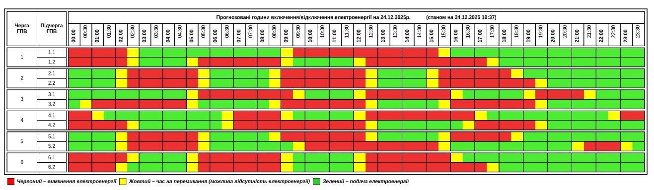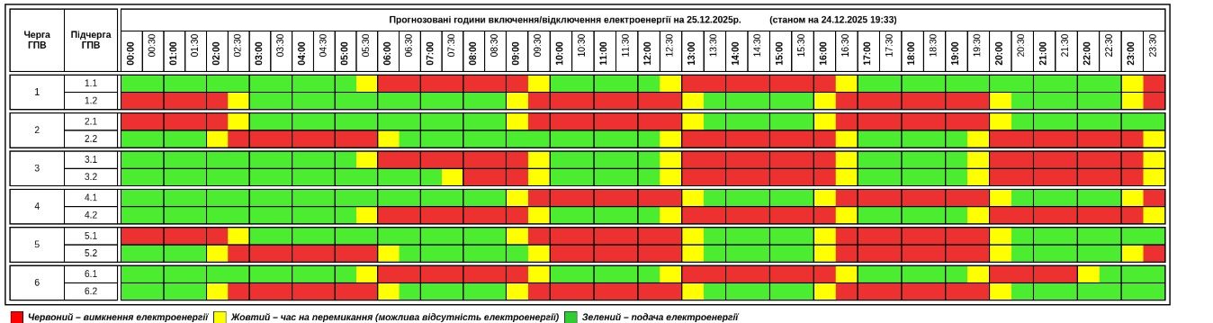 У середу, 24 грудня, АТ «Тернопільобленерго» за вказівкою НЕК «Укренерго» застосувало графіки погодинних відключень. Це зробили з метою збереження роботи обʼєднаної енергетичної системи після масштабних обстрілів РФ 23 грудня по території України.