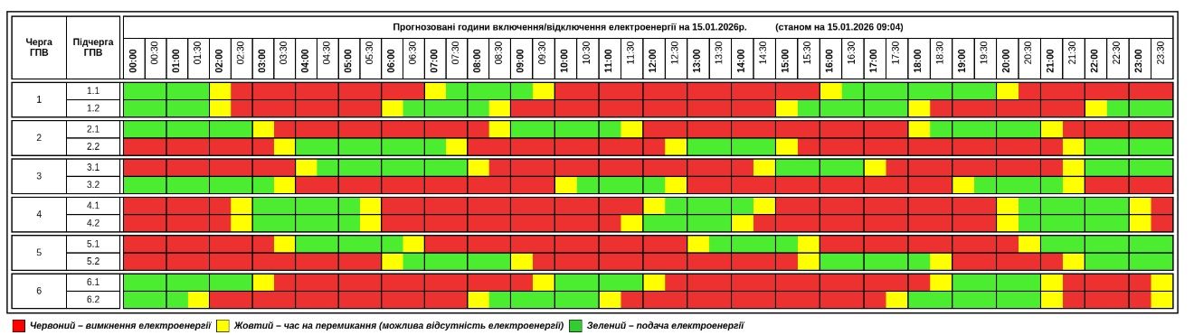 В НЕК «Укренерго» просять не користуватися потужними енергоприладами з 07:00 до 11:00 і з 15:00 до 22:00. Свою групу відключення можна дізнатися в спеціальному додатку «Тернопільобленерго». У таблиці червоним позначені години, коли електроенергії не буде, зеленим – години, у яких буде електропостачання, а жовтим – години, у які можливе відключення у випадку критичної ситуації в енергосистемі.