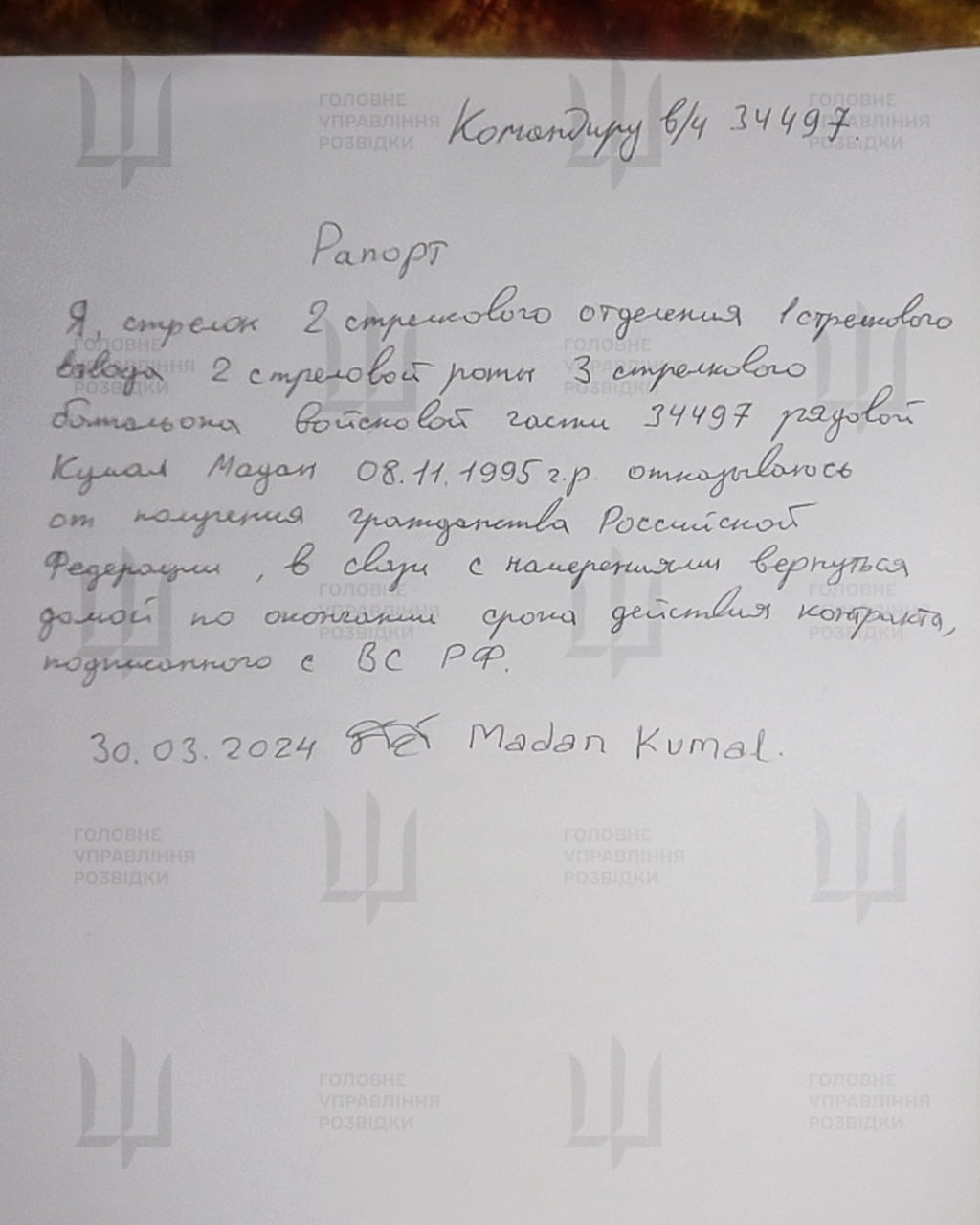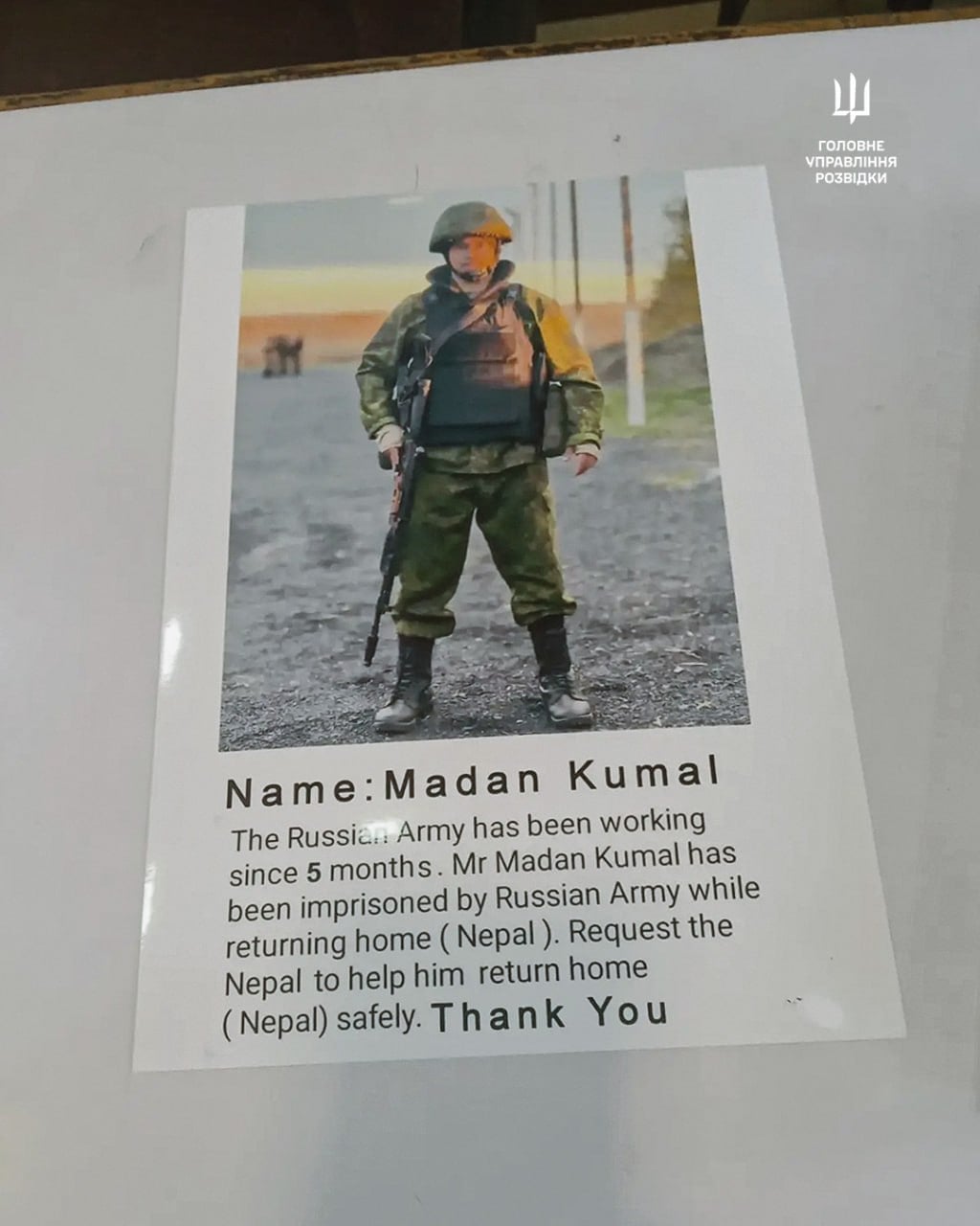 Як встановила українська розвідка, громадянин Непалу Мадан Кумал (1995 року народження) 16 жовтня 2023 року підписав контракт з російським міноборони, відповідно до якого мав служити в армії РФ чотири роки. Після військової підготовки, яка тримала кілька тижнів, непальця відправили на лінію бойового зіткнення. Згодом найманця перевели до 1-го стрілецького взводу 2-ї стрілецької роти 3-го стрілецького батальйону 87-го окремого стрілецького полку у складі 51-ї загальновійськової армії Росії (військова частина№34479).