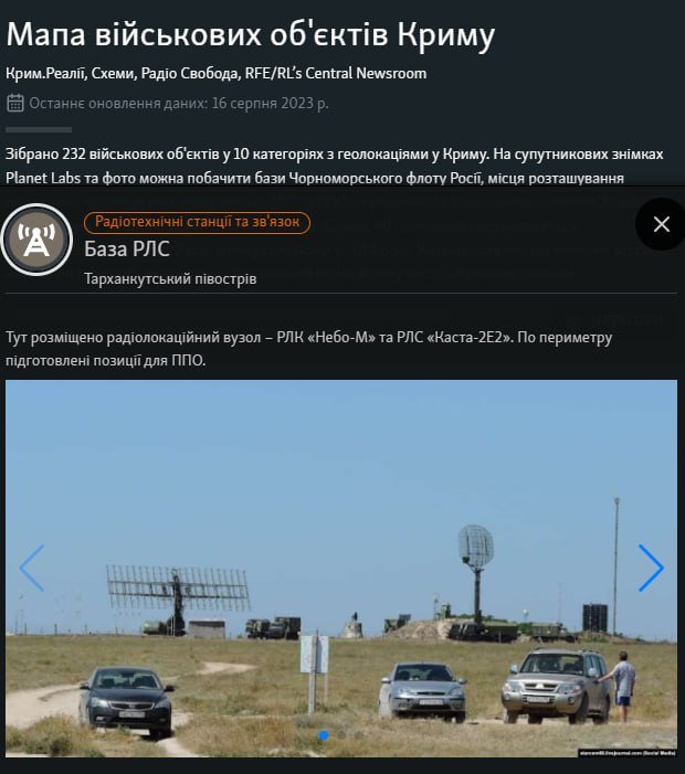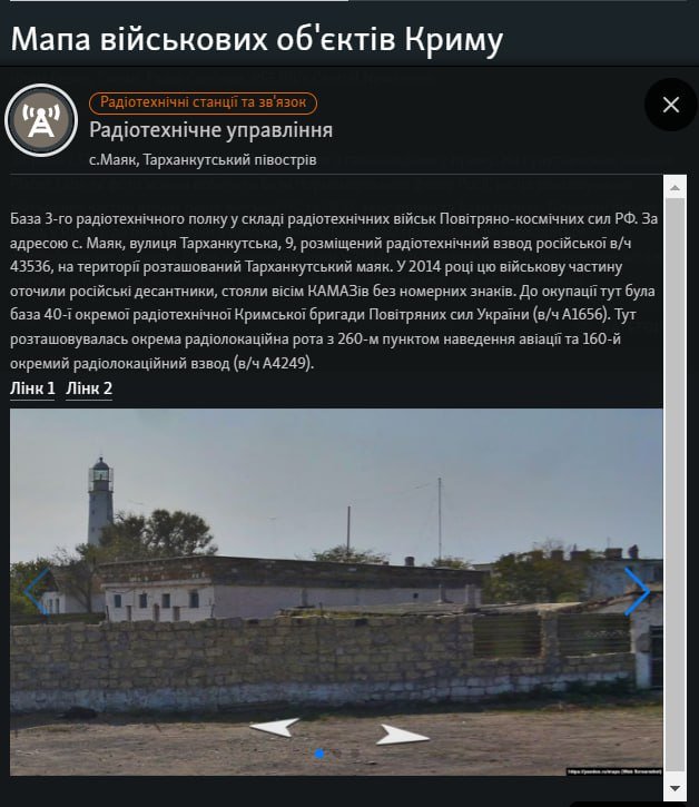 «У селі Маяк розташована база 3-го радіотехнічного полку у складі радіотехнічних військ Повітряно-космічних сил РФ. Також на тарханкутському півострові розміщений радіолокаційний вузол РЛК "Небо-М" та РЛС "Каста-2Е2"», – повідомили журналісти.