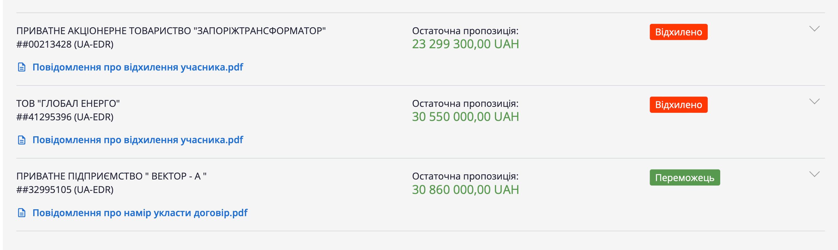 Відомо, що під час тендеру були й дешевші пропозиції – від «Запоріжтрансформатора» та «Глобал Енерго», але їх відхилили через технічні деталі та відсутність частини документів.