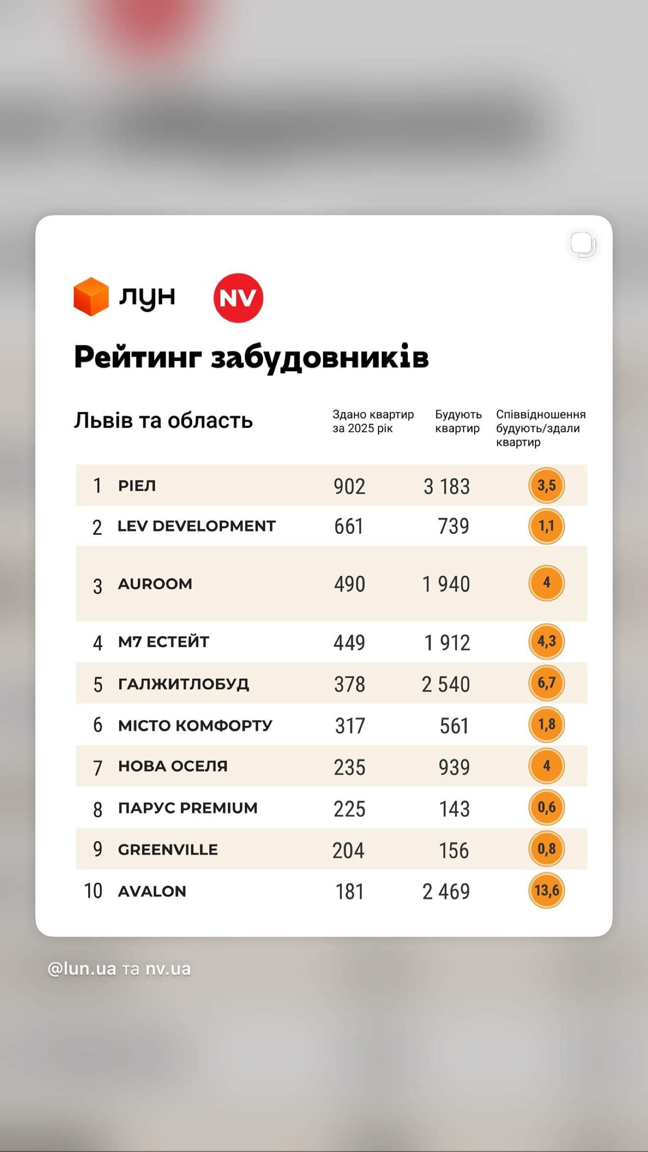 Приміром, рейтинг від ЛУН та NV базується виключно на сертифікатах введення житла в експлуатацію. Він враховує не гучні анонси чи маркетингові ходи, а лише завершені проєкти. Такий підхід дозволяє доволі об’єктивно оцінити ефективність девелоперів на основі реальних показників і виявити тих, хто справді виконує свої зобов’язання перед інвесторами.