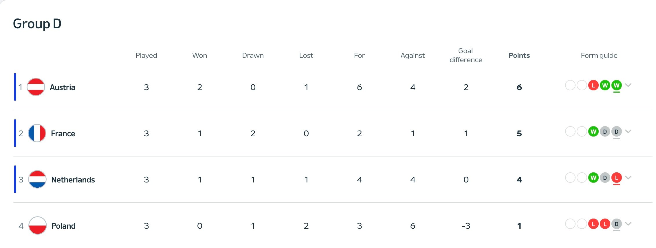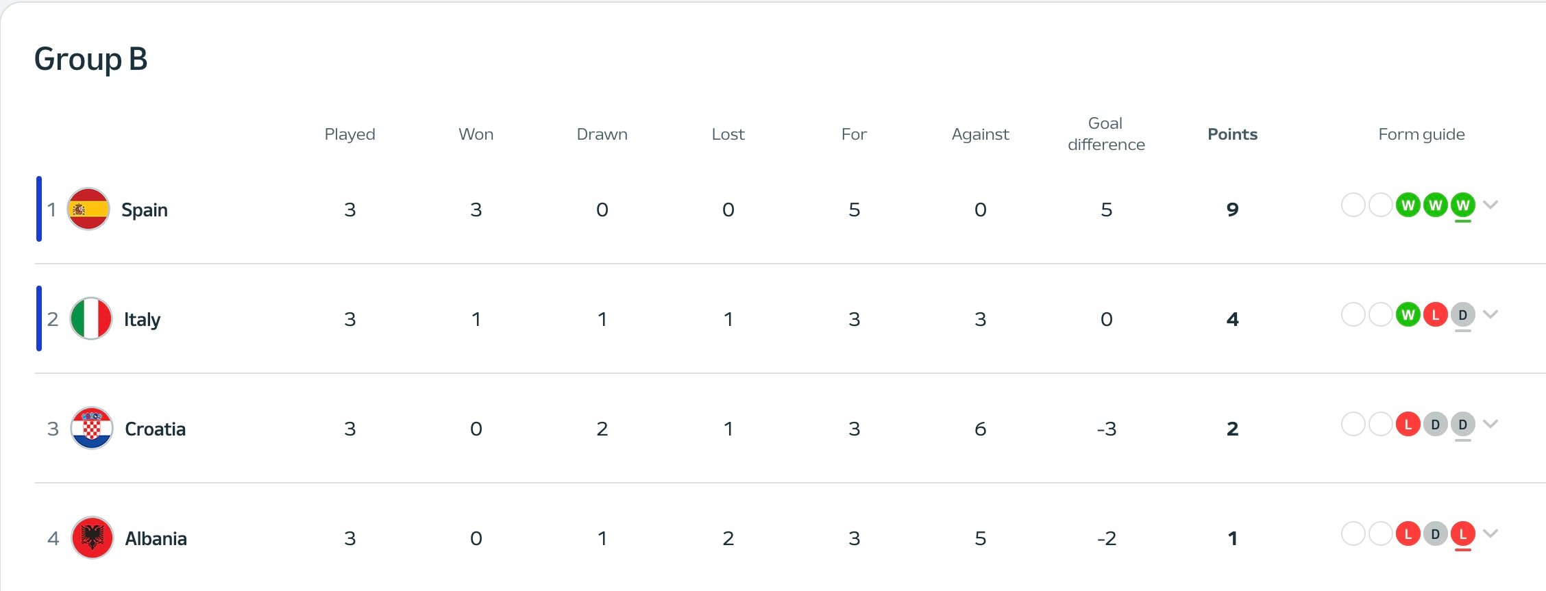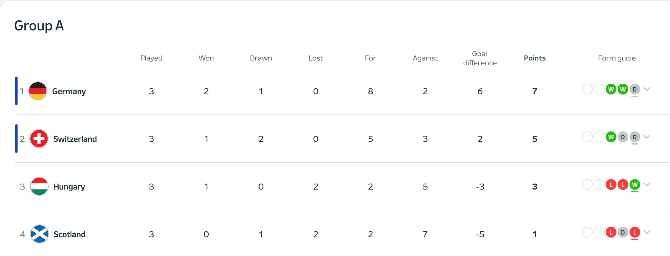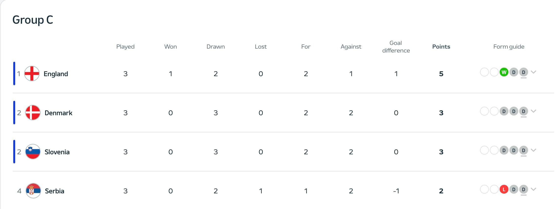 Остаточні турнірні таблиці Євро-2024 26 червня:
