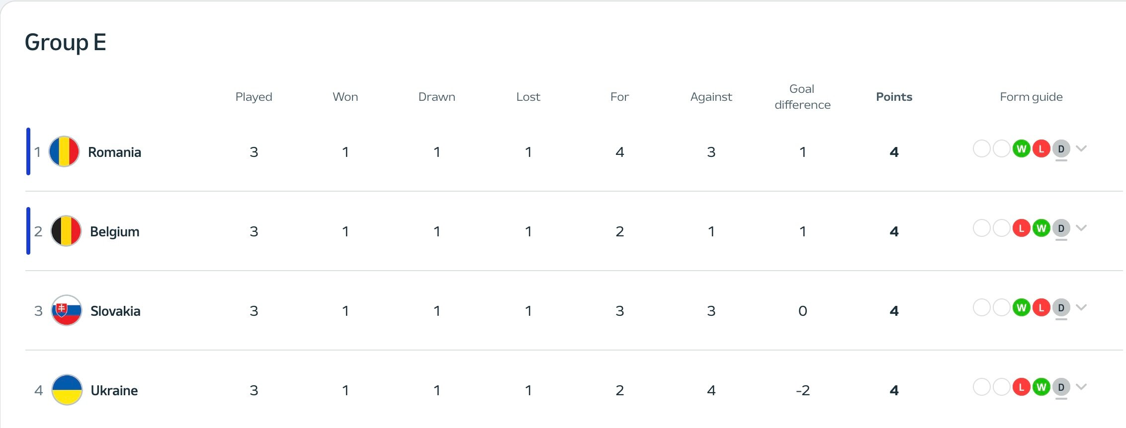 На Чемпіонаті Європи з футболу 2024 24 червня відбулися останні матчі третього туру. У групі Е українці зіграли в нульову нічию з бульгійцями, а румуни зі словаками – у результативну нічию 1:1. Усі команди отримали по 4 очки, проте Україна вилетіла через гіршу різницю мʼячів, інші три команди вийшли у плей-оф: Румунія – з першого місця, Бельгія – з другого, Словаччина – з третього.
