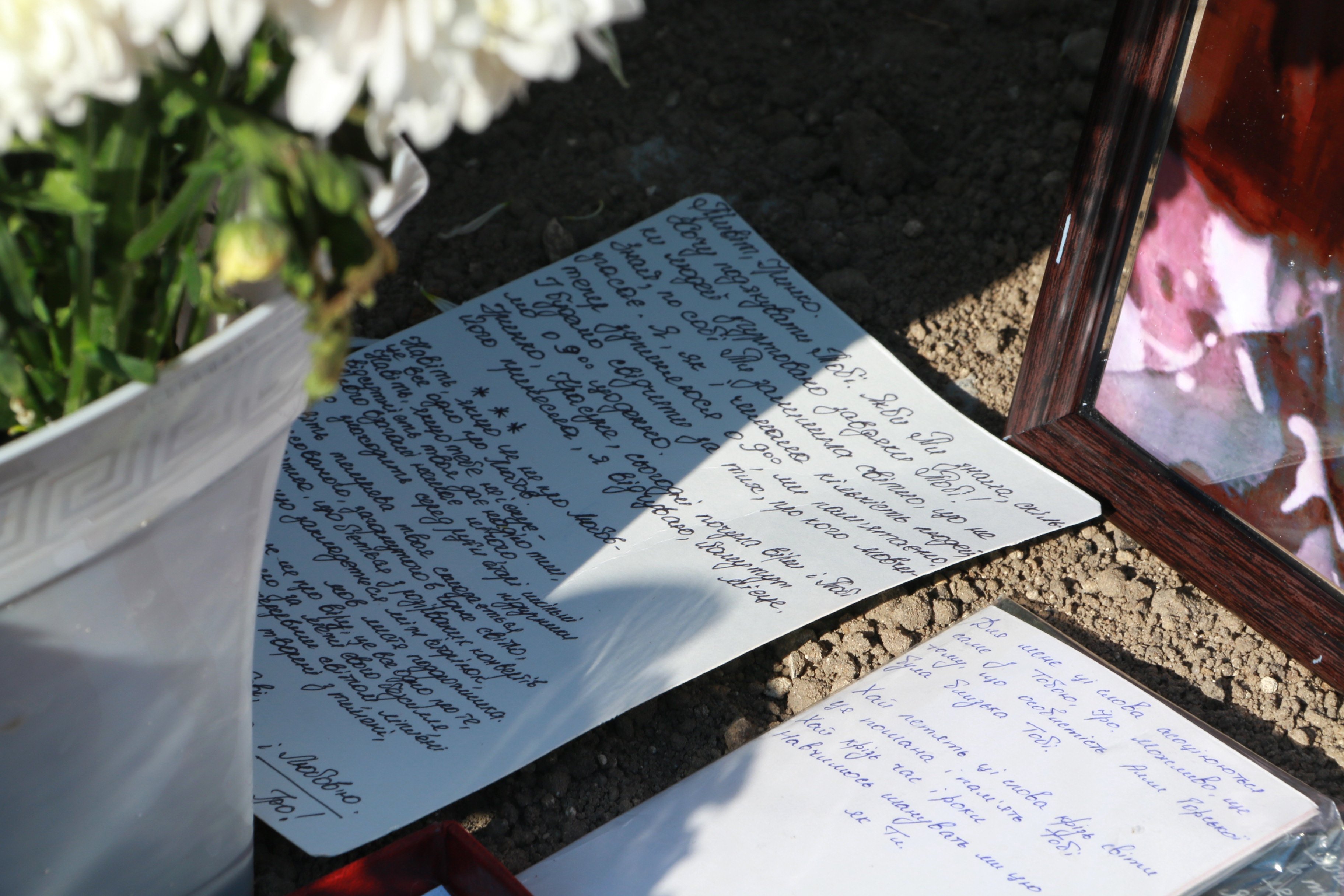 Оксана Цибух поміж білих квітів розкладає нагороди доньки. Збоку лежать два листи. Такі повідомлення від знайомих і незнайомих постійно з'являються на могилі.