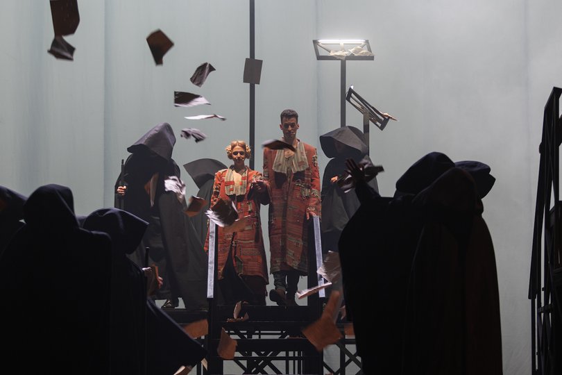 Так само працюють і костюми. Ми бачимо масивні чорні постаті в об’ємних каптурах, чи то чернечі, чи то постаті чумних докторів. Часом з під них виринають Дон Жуан, Донна Анна, Командор, Долорес, Сганарель…
