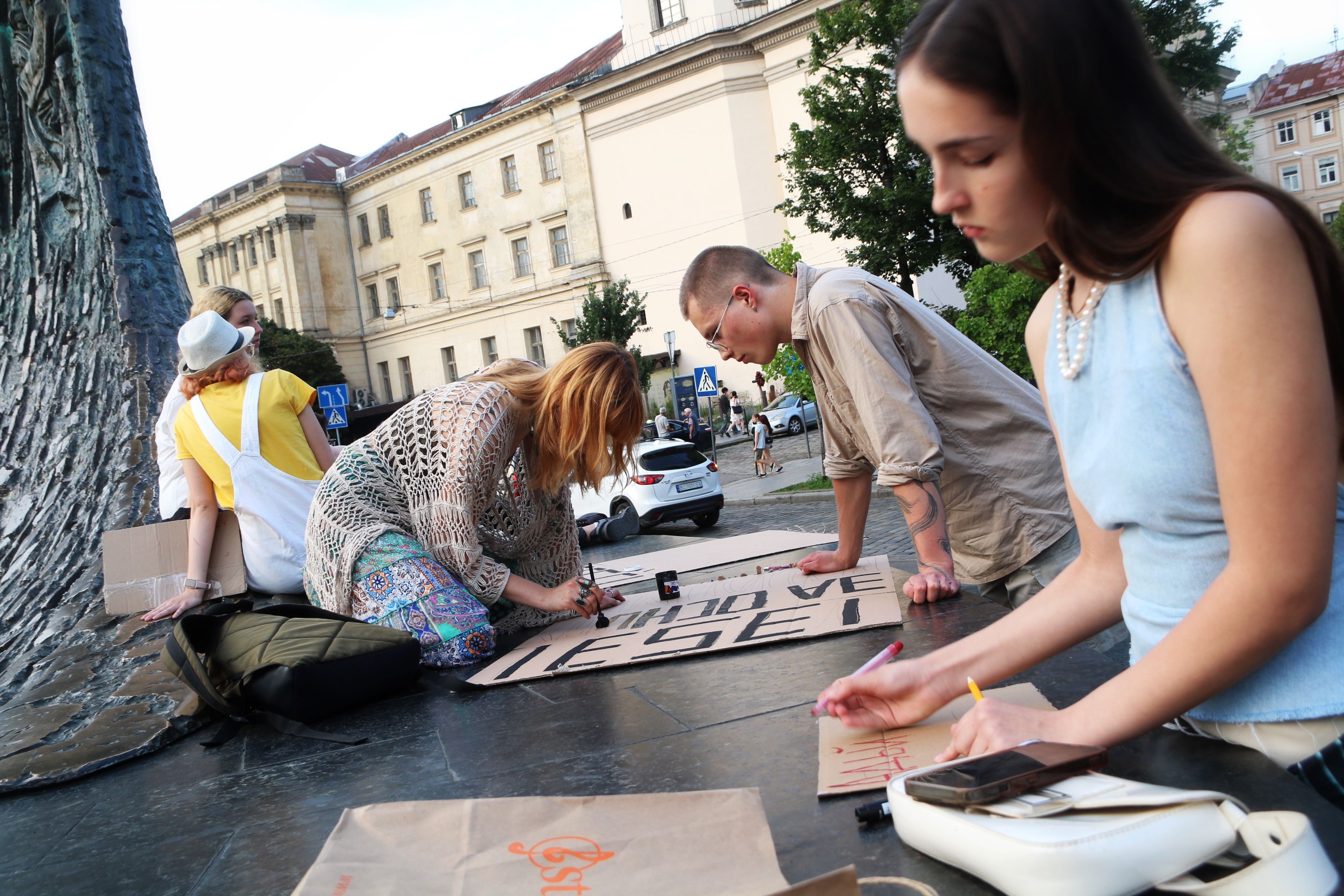 Перед кожною акцією всі охочі малювали плакати біля пам'ятника Тарасові Шевченку