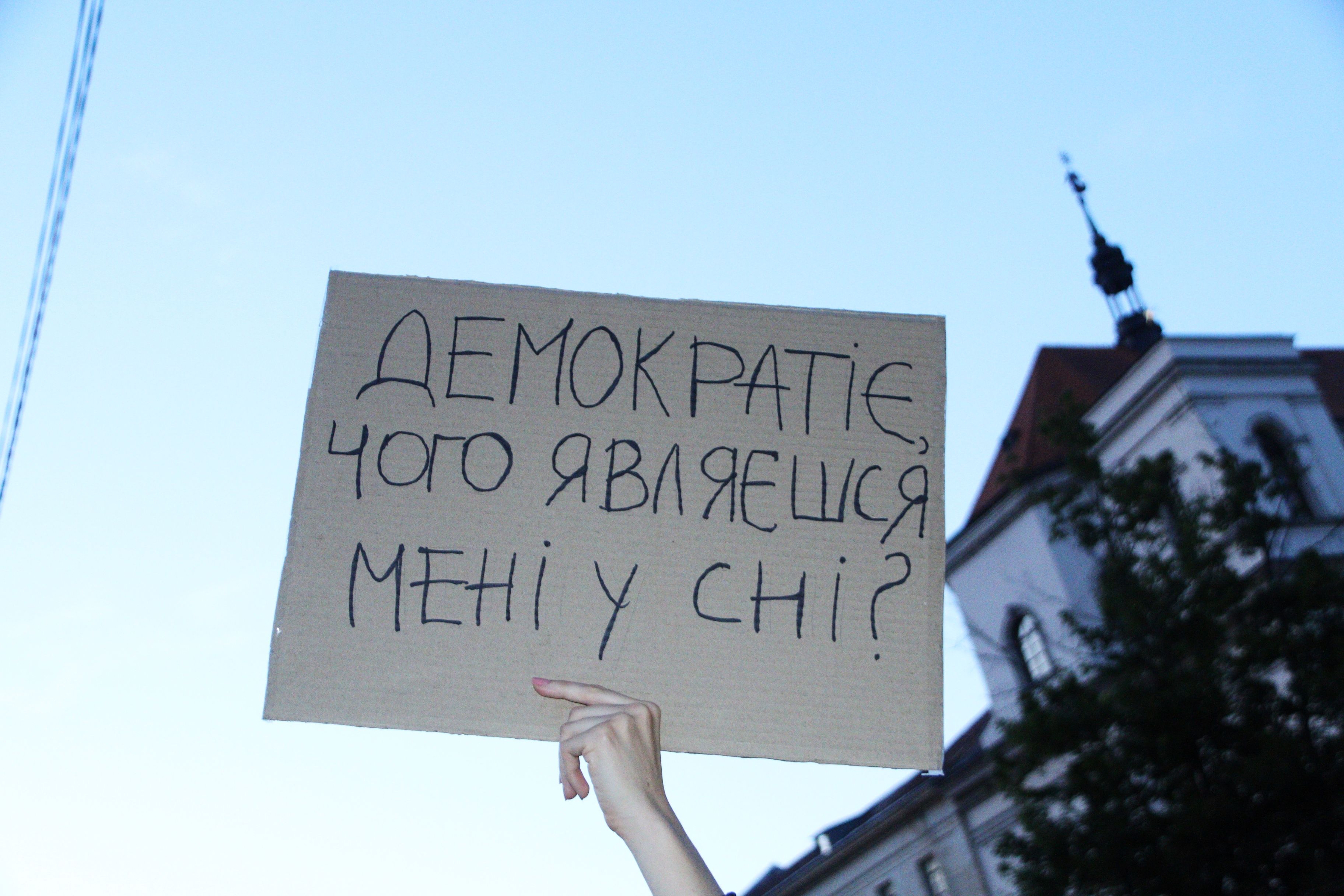 Активістка тримає в руці плакат з перефразованою цитатою Івана Франка
