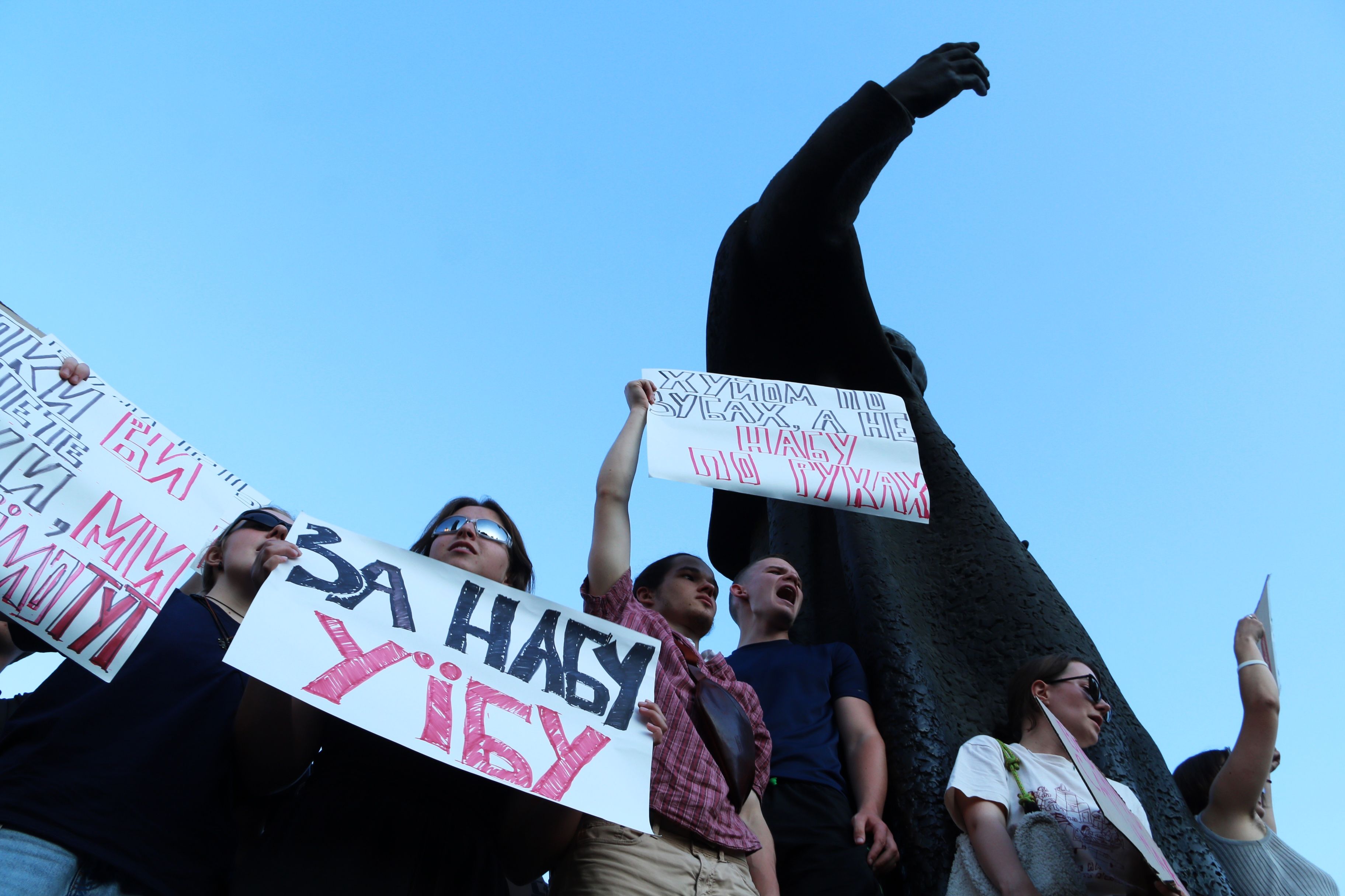 Протестувальники 24 липня позаду пам’ятника Тарасові Шевченку