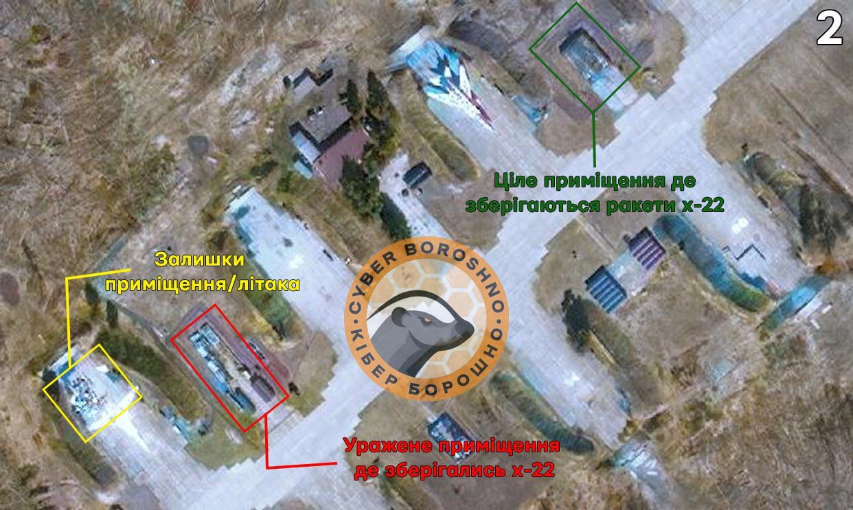 В іншій частині аеродрому, де зберігались ракети перед запуском, було уражено приміщення з ракетами Х-22/Х-32 (на зображенні 2 червоним). На знімку видно залишки після ураження (на зображенні 2 жовтим), ймовірно, від приміщення з ракетами, але також можуть бути частинами літака.