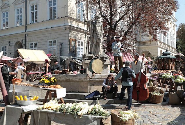 На площі Ринок розташувався справжній… ринок, де гори усілякого краму продають колоритні персонажі. У Львові – 1938 рік. Саме тоді відбувається дія музичної ретро-комедії «Шляхетні волоцюги», заради фільмування якого на цілий день навіть перекрили рух трамваїв.