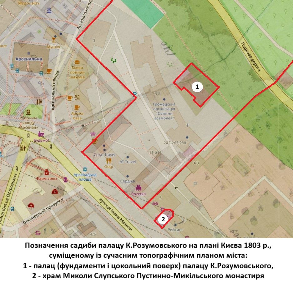 За 10-15 м від фундаментів є один з двох житлових будинків 1935-1939 років. Їх звели на місці садиби, яку Кирило Розумовський наприкінці XVIII століття орендував у Микільського Пустинного (Слупського) монастиря. Монастирську садибу з храмом Миколи Слупського (Малим Миколою) 1715 року знищили у середині 1930-х років. Під час спорудження у 1939 роках будинків на вул. Івана Мазепи, 3-а та 3-б виявили побутові речі XVIII століття, зокрема керамічну посудину «тиква».