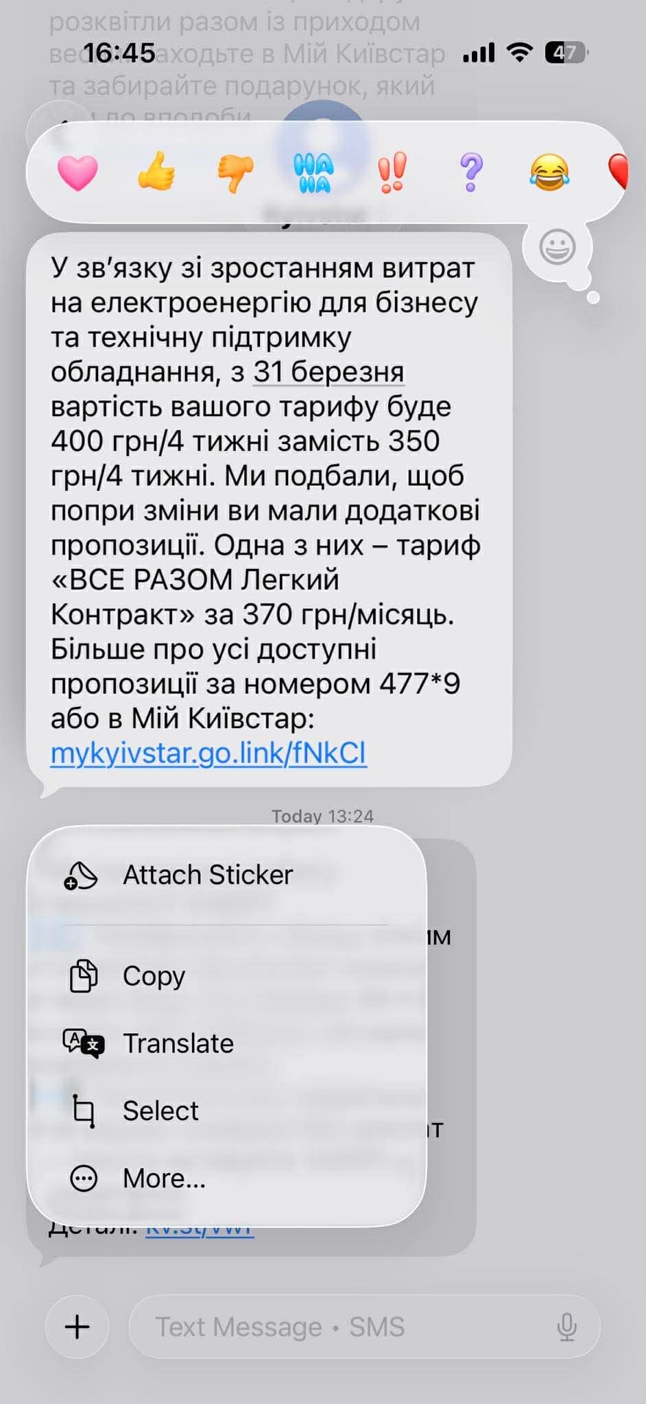 Абоненти найбільшого мобільного оператора України «Київстар» почали отримувати SMS із повідомленнями про зміну вартості тарифів. Нові ціни почнуть діяти вже з кінця березня.
