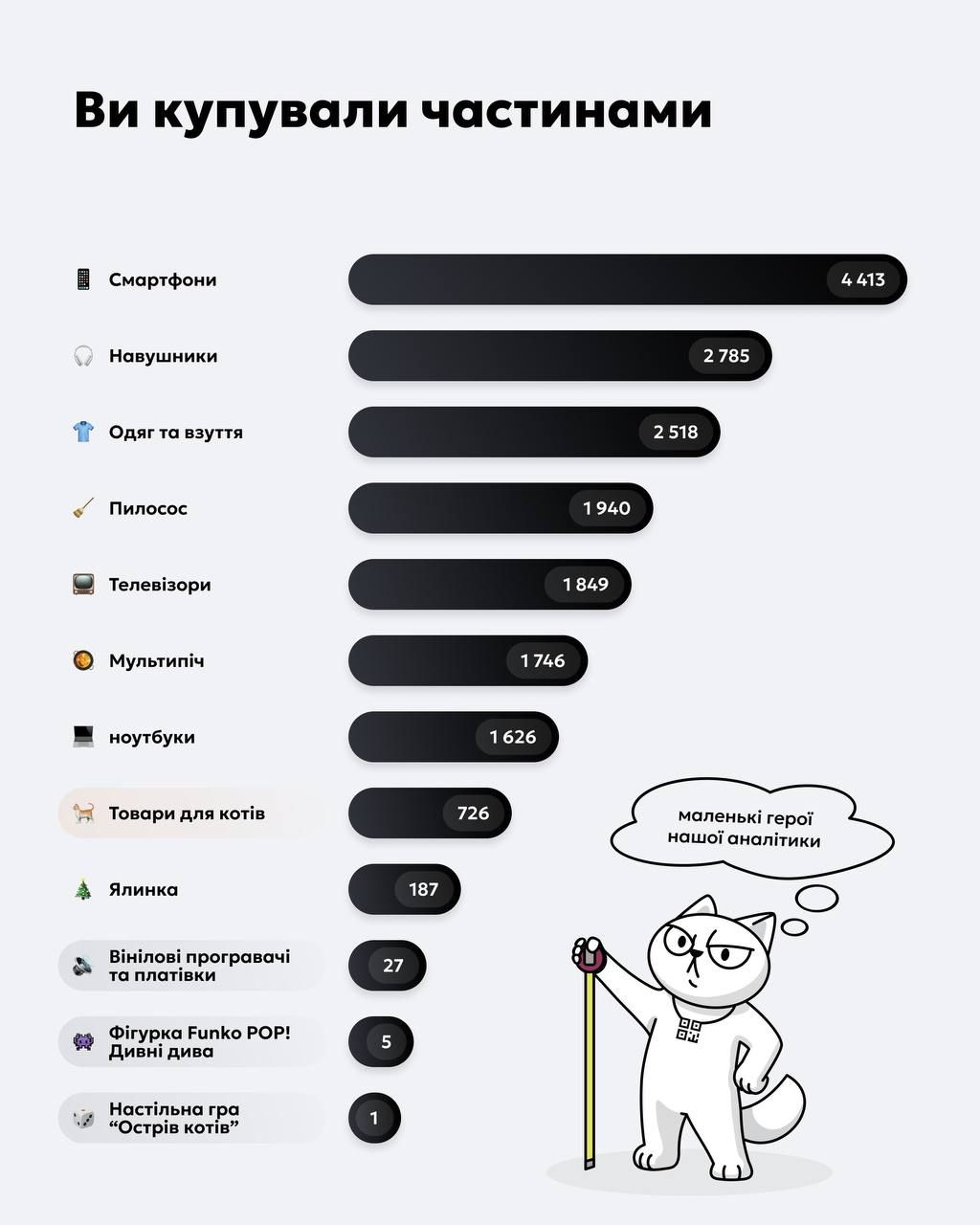 До списку також потрапили товари для котів, ялинки, вінілові програвачі та платівки, фігурки Funko POP «Дивні дива» та настільна гра «Острів котів».
