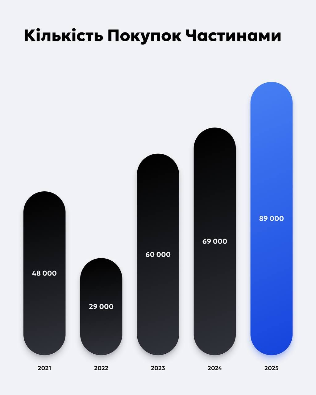 За даними, які опублікував засновник компанії Monobank, кількість покупок частинами у 2025 році сягнула позначки у 89 тисяч, що на 20 тисяч більше, ніж минулого року, і більше, ніж у будь-який рік до того.