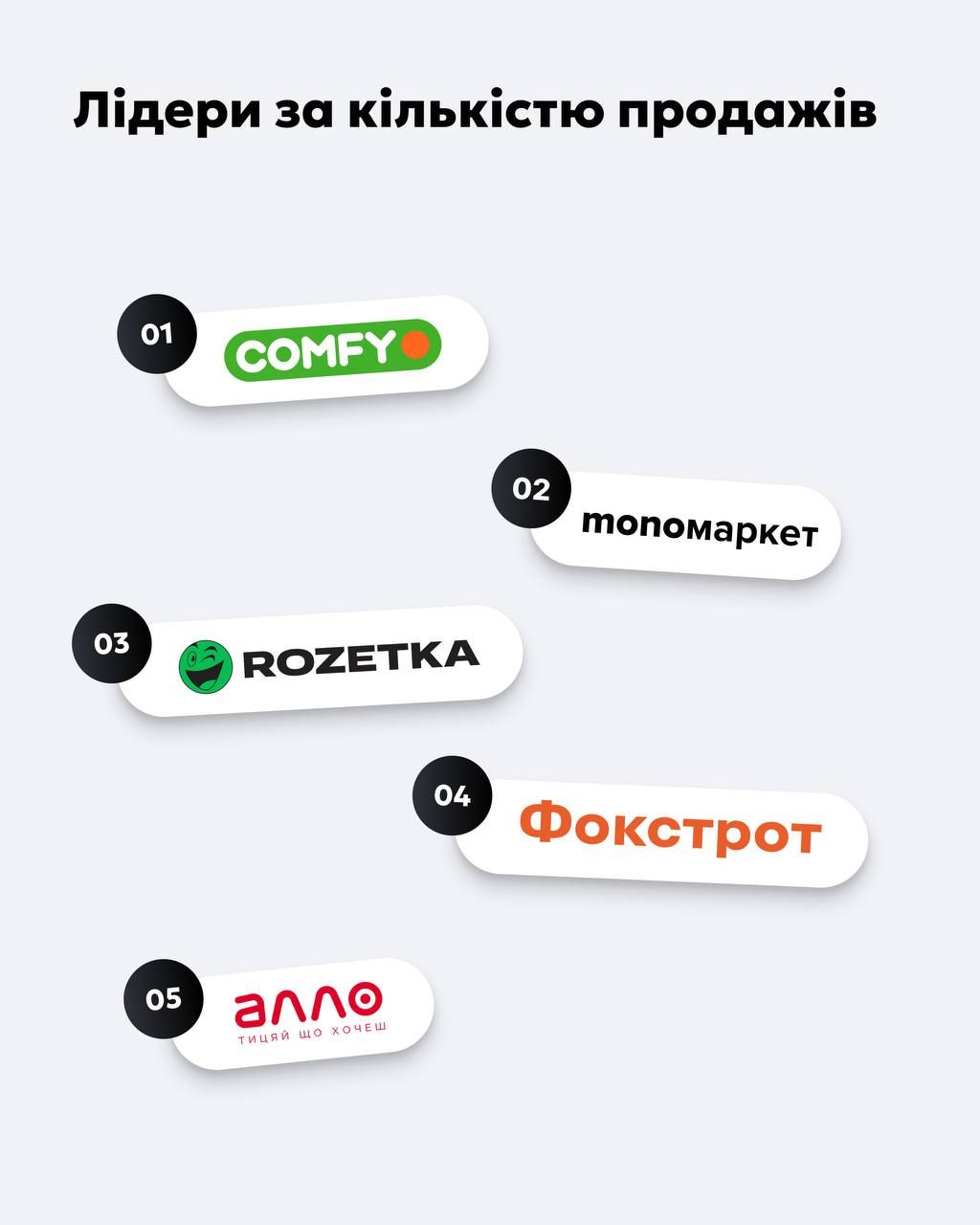 Найбільше покупок українці зробили у мережі магазинів побутової техніки Comfy. На другому місці за кількістю проданих товарів опинився фірмовий магазин Monobank – Monomarket. До лідерів за кількістю покупок віднесли також Rozetka, «Фокстрот» та «Алло». До слова, рекорд за найвищий чек встановив український ювелірний магазин SOVA.