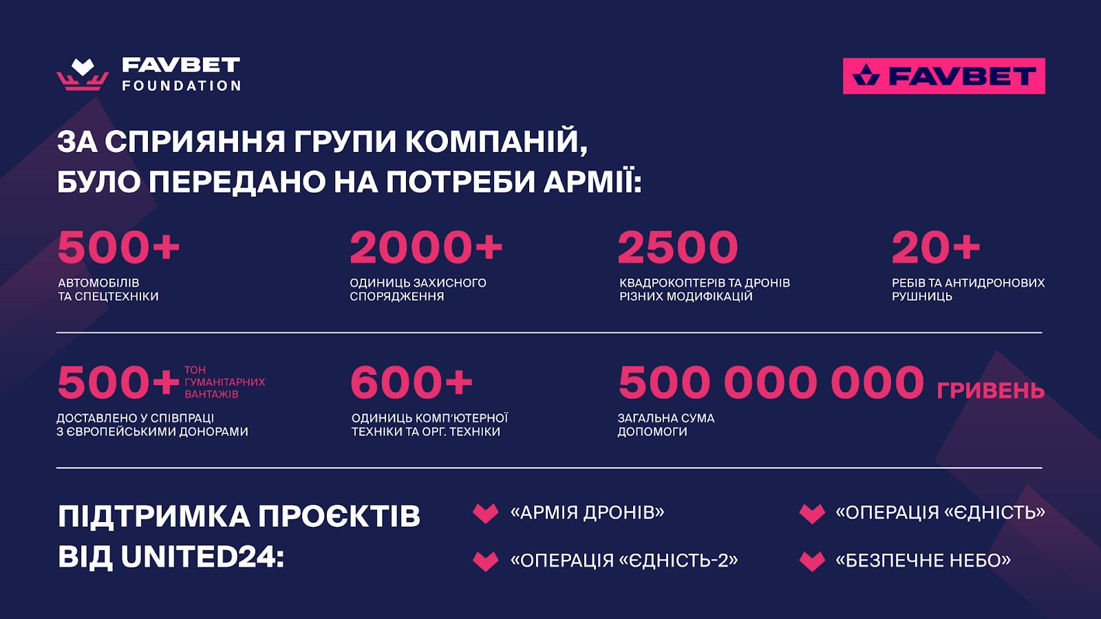 Окремо варто відзначити співпрацю з фандрайзинговою платформою UNITED24. За останні три роки фонд та компанія Favbet підтримали більшість її провідних проєктів: від закупівлі пікапів для ініціативи «Армія дронів» до придбання безпілотників у межах двох етапів операції «Єдність».