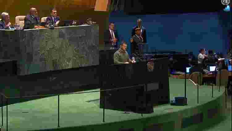 15У вівторок, 19 вересня, президент України Володимир Зеленський виступив під час загальних дебатів 78-ї сесії Генеральної асамблеї ООН. Глава держави розповів про ядерну загрозу від Кремля, провокування Росією воєнних конфліктів, згадав убитого власника ПВК «Вагнер» Євгенія Пригожина та закликав світ не укладати тіньові домовленості з росіянами.