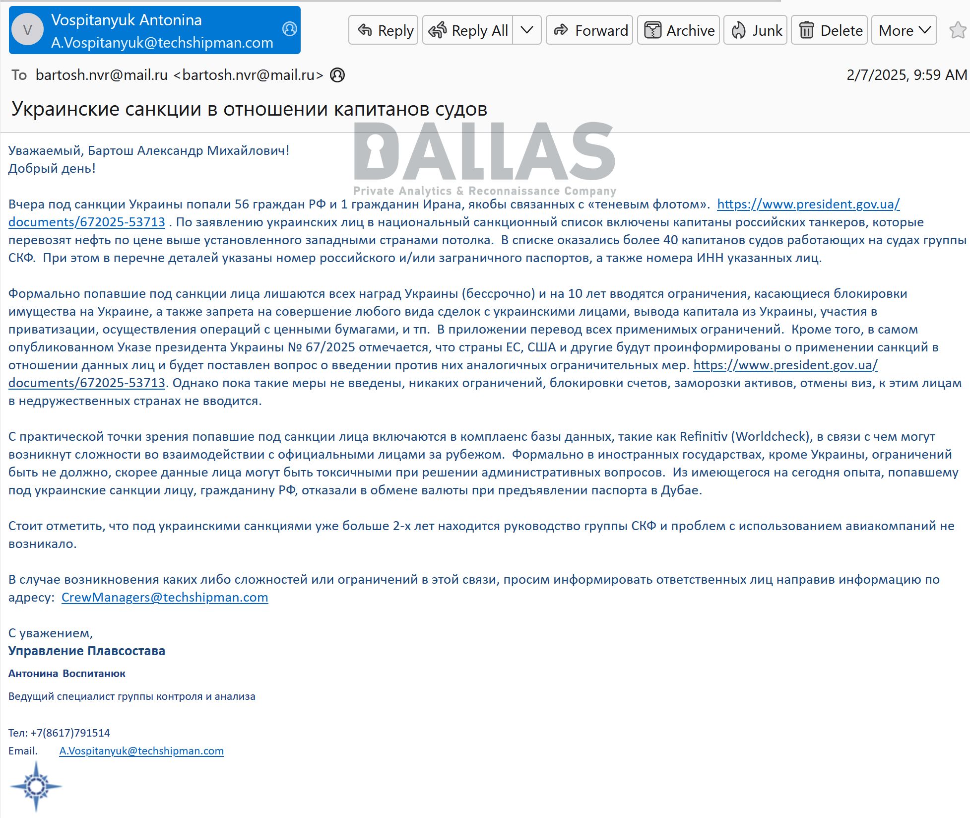 «Поки після оголошення санкцій Україною дзеркальні обмежувальні заходи не будуть запроваджені з боку західних країн, ніяких реальних бар’єрів, блокування рахунків, замороження активів чи анулювання віз у “недружніх країнах” щодо таких осіб не спостерігається. З практичного погляду, санкціоновані особи дійсно потрапляють до баз комплаєнсу, зокрема до системи Refinitiv (World-Check), що може створювати певні труднощі під час взаємодії з іноземними чиновниками. Формально – в юрисдикціях поза Україною – таких обмежень не існує, однак у адміністративному полі ці особи можуть розглядатися як “токсичні” фігури», – йдеться у листі, який «Совкомфлот» надіслав капітану Алєксандру Бартошу.