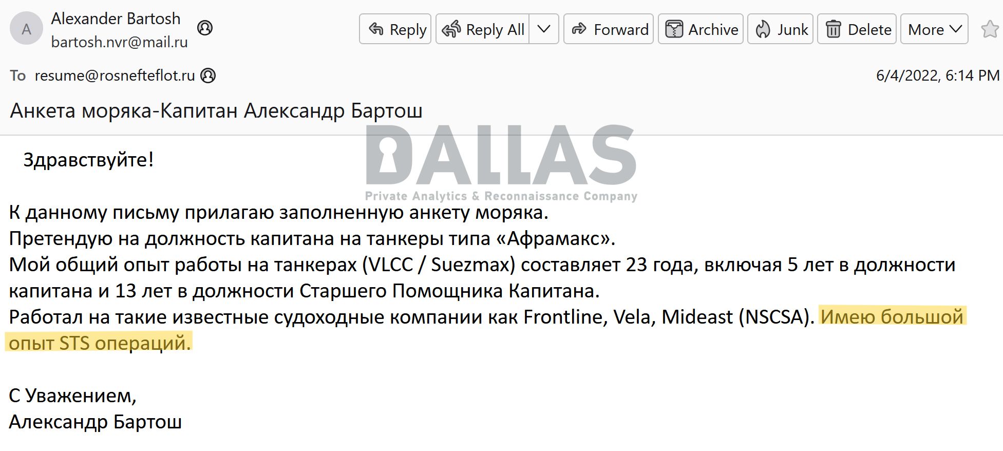 Сам капітан Алєксандр Бартош, зауважує Dallas, чудово розуміє специфіку роботи у тіньовому флоті. Зокрема, у своїй анкеті моряка, надісланій «Роснефтефлот», що займається комплектуванням екіпажів, Бартош акцентує на досвіді у проведенні операцій ship-to-ship (STS) – перевантаження вантажу між двома суднами в морі без участі берегового термінала. STS операції, зокрема, використовують для передачі сирої нафти, скрапленого газу, сипучих вантажів та інших нафтопродуктів.