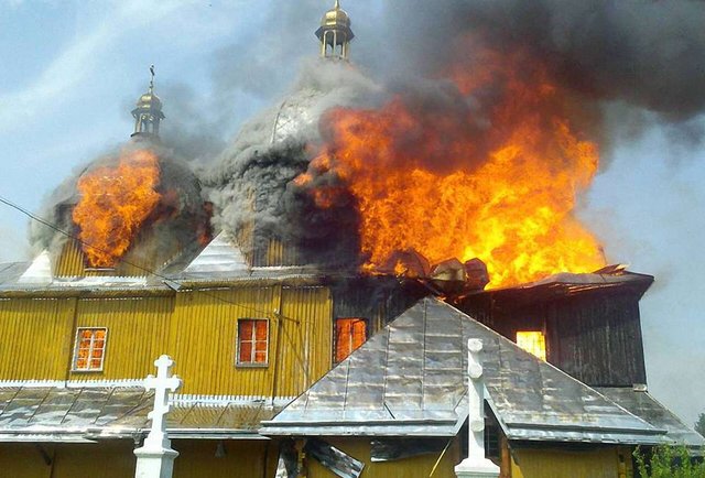Через дві години паламар повернувся до храму, щоб видати речі для похорону: в той день у селі померла жінка. Менш, як за годину, церква почала горіти. Під час гасіння пожежі місцеві мешканці виламали двері з боку захристя, щоб перевірити електрощитову. Рубильник був відімкнений.
