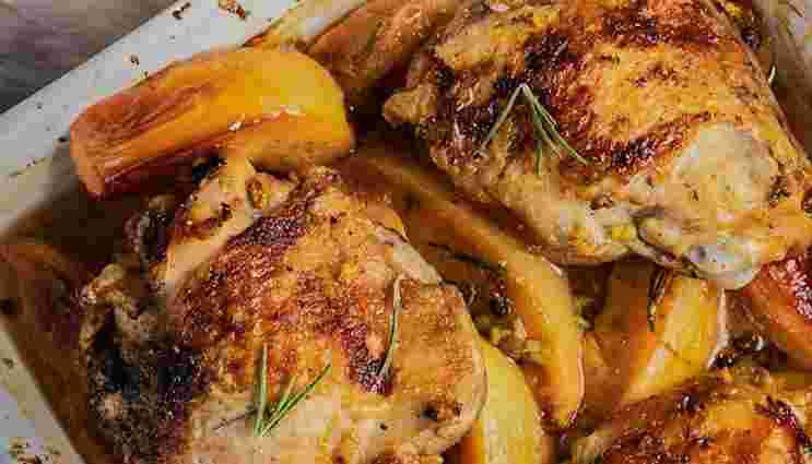 Нафарширувати курку дрібно нарізаною айвою, зашити або заколоти. Покласти курку в рукав для запікання, потім обкласти курку у рукаві скибками айви і картоплі, полити айву з картоплею сумішшю меду та часнику, яка стікла з курки. Запікати приблизно годину при 180-200°C.