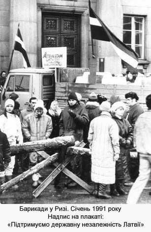 Відтак розпочинаються дуже драматичні події (і не лише у Латвії). Отже, – початок 1991 року… Спеціальний підрозділ (ОМОН) 2 січня захоплює Будинок преси з метою не допустити «вільнодумства». Масово закриваються газети. Голова латвійського парламенту та уряду в Москві 12 січня зустрічаються з М.Ґорбачовим, який обіцяє запобігти насильству в Ризі, а вже 13 січня совєцькі десантники захоплюють телевежу в литовському Вільнюсі, вбивають 14 та ранять 110 неозброєних маніфестантів. Боячись подібних подій у Ризі, «Народний фронт» закликає мешканців прибути до Риги й вибудовувати барикади, аби захистити місто. У місті збираються понад 500 тис. його захисників. Проте цим все не завершується – 15 січня ОМОН захоплює Ризьку школу міліції, наступного дня «бійці» посеред вулиці підступно розстрілюють неозброєного шофера автобуса. Апогеєм безчинств безпорадної старої влади стає 20 січня, коли ОМОН обстрілює Міністерство внутрішніх справ, під час чого гине п’ятеро людей, серед них – школяр… У країні паніка, страх і невизначеність. Однак барикади ніхто не розбирає…