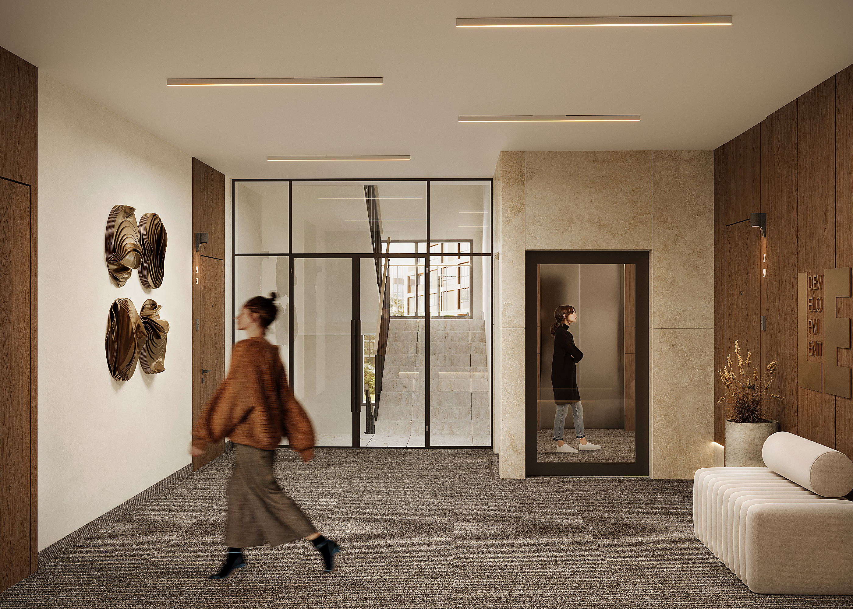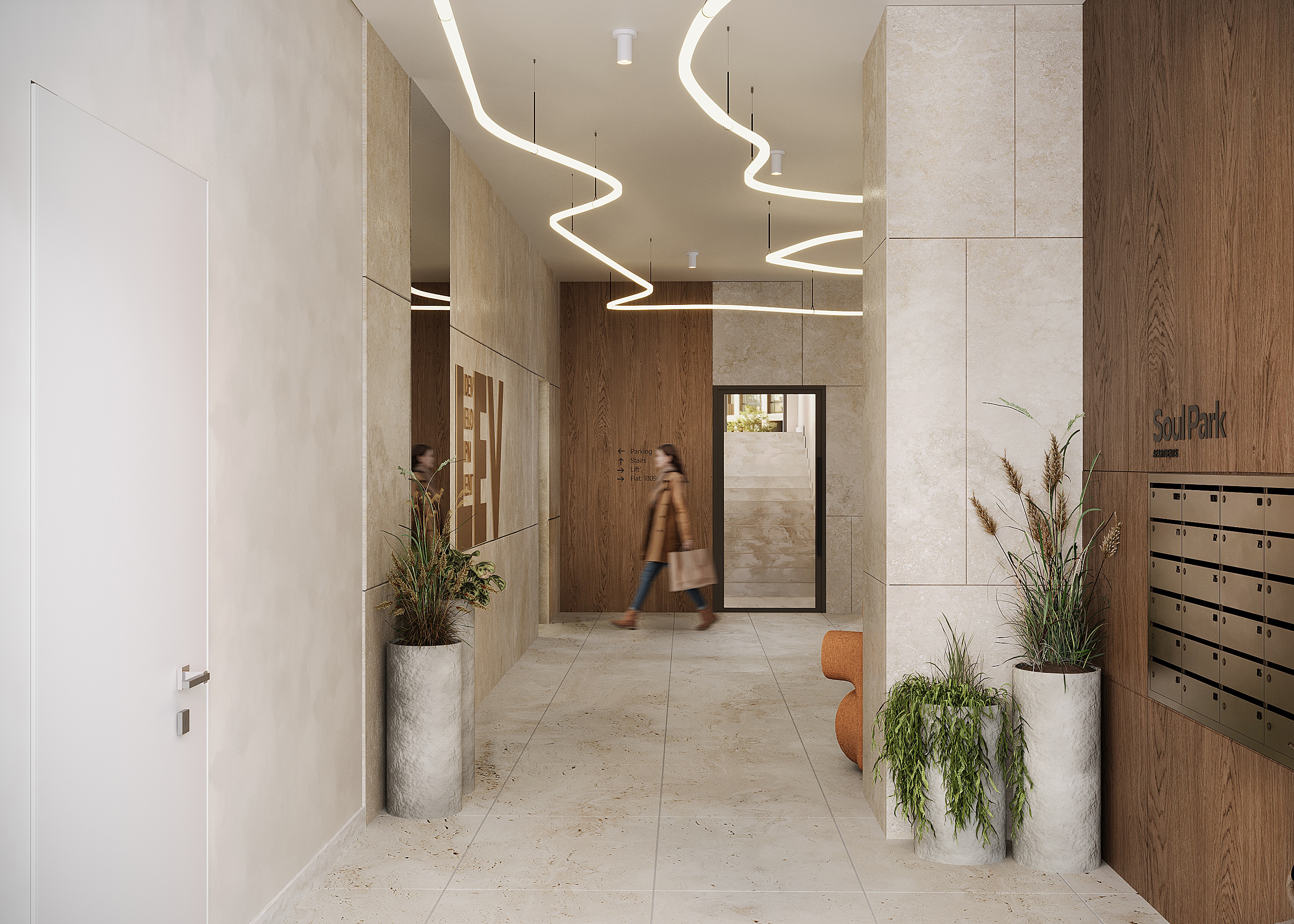 Холи у ЖК SOUL PARK – це не просто технічні приміщення з ліфтами та сходами. Вхідна група стає естетичним простором для спілкування, очікування гостей або навіть розв'язання нагальних робочих питань. Тут функціональність вдало поєднується з мистецтвом: картини та артінсталяції сучасних авторів створюють особливий емоційний зв'язок мешканців з творчістю.
