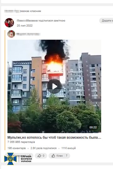 Як у четвер, 23 березня, повідомила прес-служба СБУ Івано-Франківської області, 62-річна проросійська агітаторка в «Однокласниках» публікувала дописи, в яких російська агресивна війна позиціонувалася як «визвольна», а Україна та західні партнери обвинувачувалися у «бойових діях проти мирного населення».