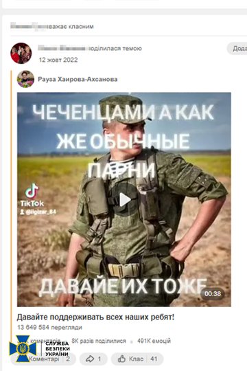 «Жінка вважала "класним" вбивство росіянами українських захисників та обіцянку Кадирова "спалювати шайтанів". Вона вболівала за угруповання "Вагнера", захоплювалася терористами Захарченком та Павловим. Під час обшуку фігурантка намагалася знищити свій телефон із доказами», – йдеться у повідомленні СБУ.