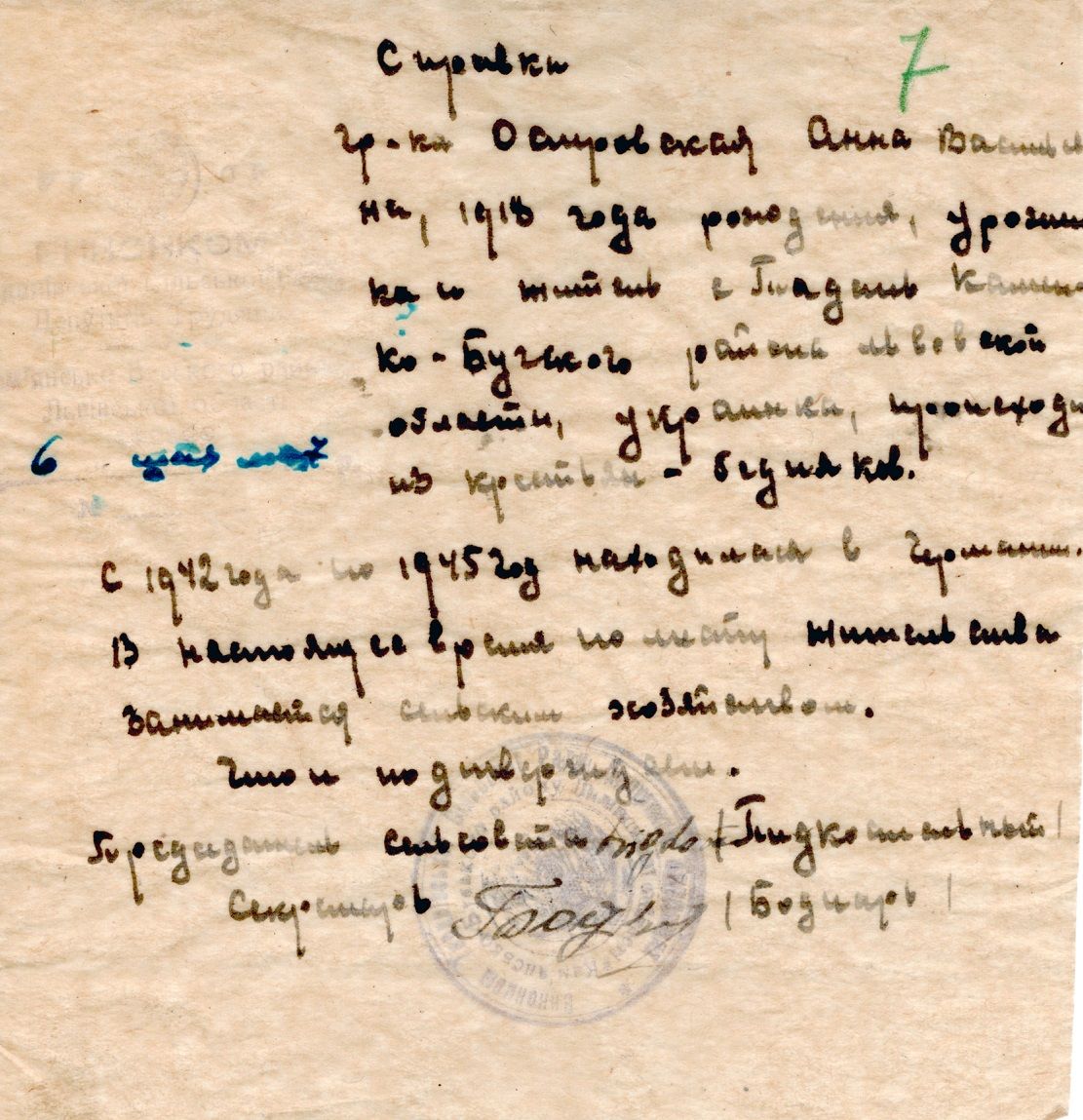 «Ті з них, які поверталися додому, а це більшість, вимушено проходили радянські перевірки на політичну благонадійність, так звані фільтрації. Це була досить принизлива процедура: їх допитували чи, мовляв, не добровільно виїхали, чи не співпрацювали якимсь чином з нацистами, чи не проводили антирадянської діяльності, чи не контактували із західними військовими – американськими, британськими, французькими чи іншими. При цьому вилучали особисті документи, а іноді фото та листи. Таку ж перевірку Анна Островська пройшла у вересні 1945 року у перевірочно-фільтраційному пункті НКВС у Мостиськах», – каже Андрій Усач.