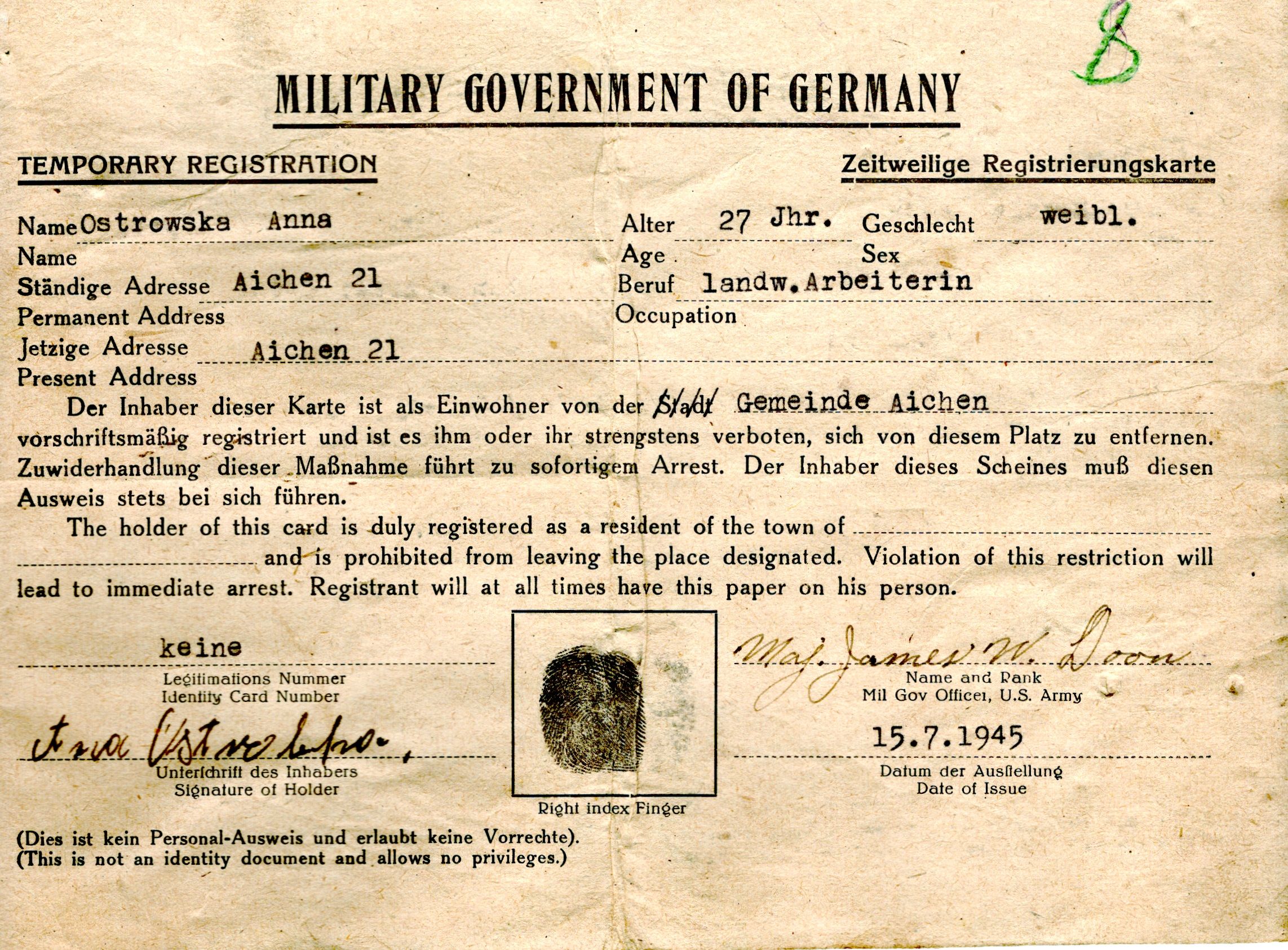 Так було і у випадку з Анною Островською, адже в її справі є відповідна приписка, що її звільнили війська США. Поступово з цього обліку колишніх примусових робітників та робітниць почали знімати в другій половині 1950-х років.