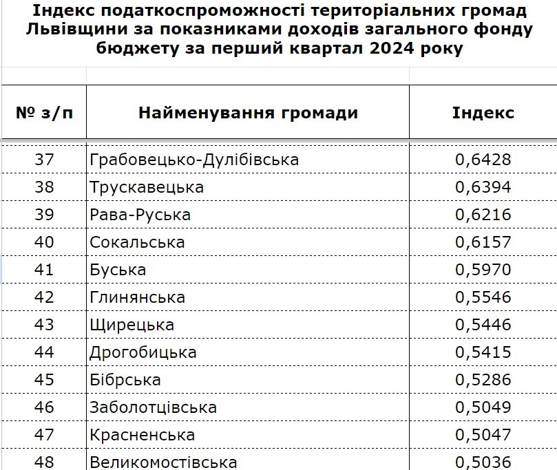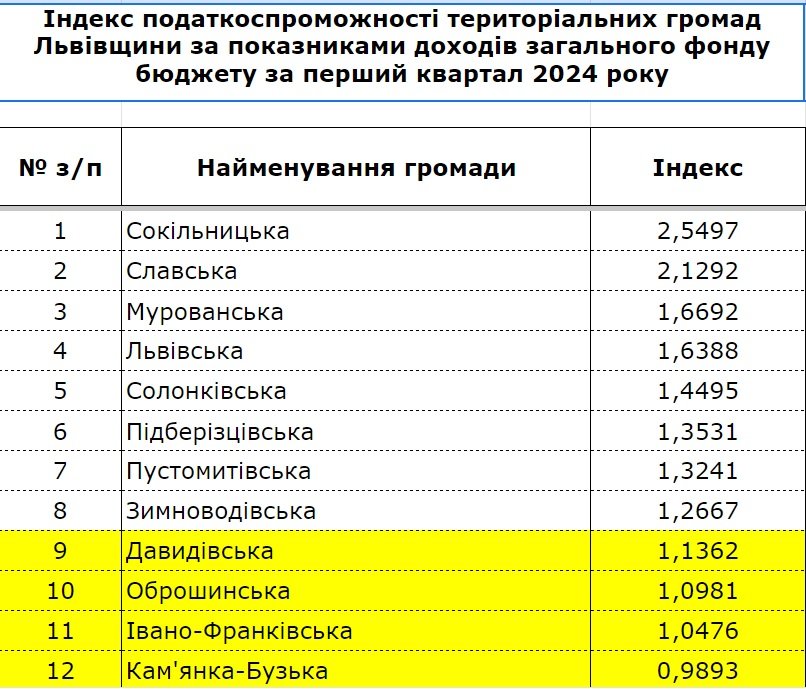 Ще 1️1 громад, зауважили фінансисти, можна вважати цілком спроможними. Це Давидівська, Оброшинська, Івано-Франківська, Кам’янка-Бузька, Радехівська, Стрийська, Шегинівська, Сколівська, Тростянецька, Жидачівська і Городоцька.
