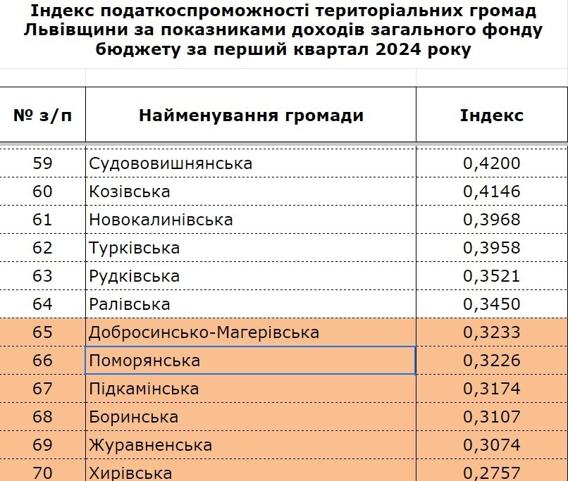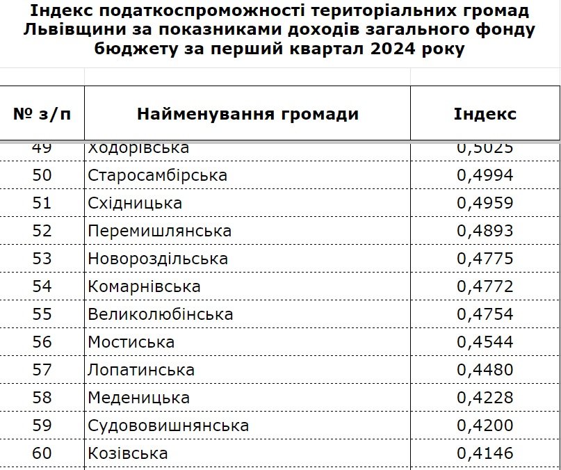 Відповідно до рейтингу, найбіднішими є Добромильська, Бісковицька та Стрілківська громади. У них індекс податкоспроможності приблизно уп’ятеро менший, ніж загалом в області.