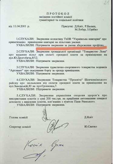 Андрій Москаленко розповів, що представники мерії зустрілися з власниками приміщення. Під час розмови виявилося, що попередні власники, ТзОВ «Українська книгарня», отримали це приміщення 2001 року для облаштування книгарні за 11 тис. грн (зі знижкою 90%). Проте згодом продали нерухомість.