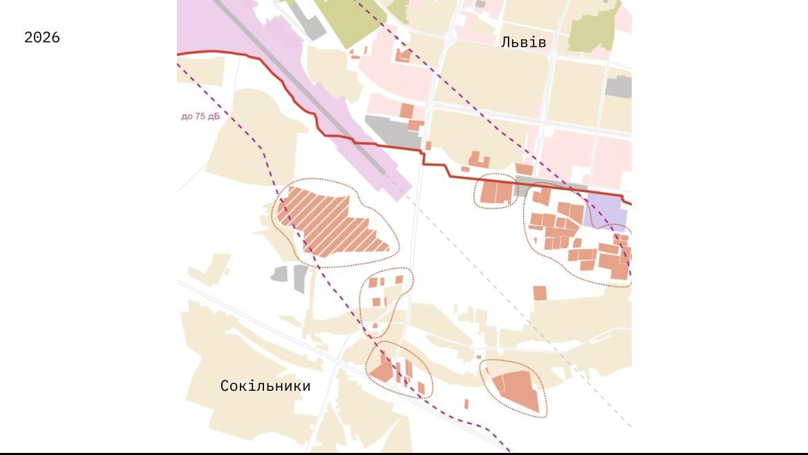 Картинка ліворуч ілюструє стан забудови приаеродромної території на 2006 рік. На картинці праворуч можна побачити сучасний стан забудови. Коричневим кольором позначена нова забудова. Червоним кольором позначена лінія, яка розмежовує Львів і Сокільники. Щоб порівняти зміни на фото, скористайтесь повзунком, який можна рухати вправо чи вліво. Візуалізація ЛМР